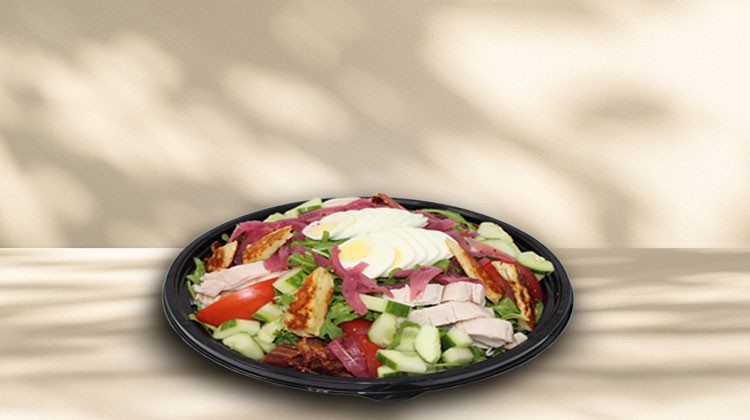 "Squared" Hard Boiled Egg, Turkey, Smoked Bacon, Seared Halloumi, Fresh Tomato, Cucumber, Pickled Red Onion, Baby Arugula with Citrus Vinaigrette. House Croutons.