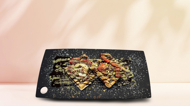 Two Golden Belgian Waffles Layered With Pistachio And Chocolate Drizzle, Topped With Fresh Strawberries, Crisp Kataifi And Creamy Pistachio Gelato